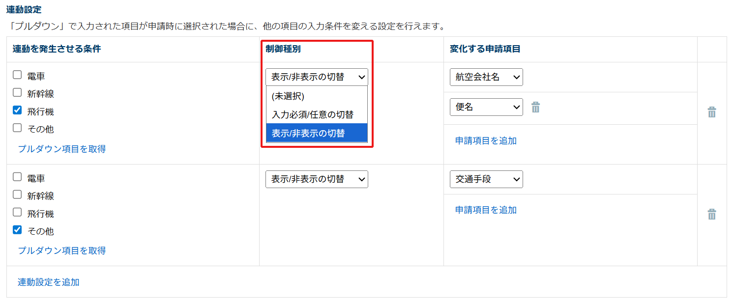 • 連動を発生させる選択肢を指定したあと 「制御種別」 に 「表示/非表示の切替」 を選択し、連動先となる項目を 「変化する申請項目」 で設定します。