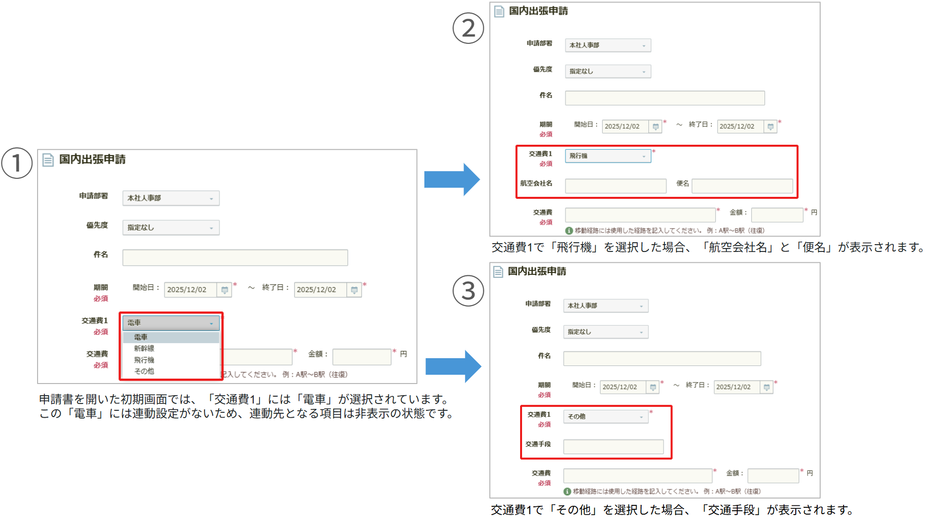 項目 「交通費1」 の選択肢には、 「電車」 「新幹線」 「飛行機」 「その他」 を設定。 「飛行機」 と 「その他」 の選択時のみ、それぞれ連動先の項目が表示される設定をした場合の動作例です。
